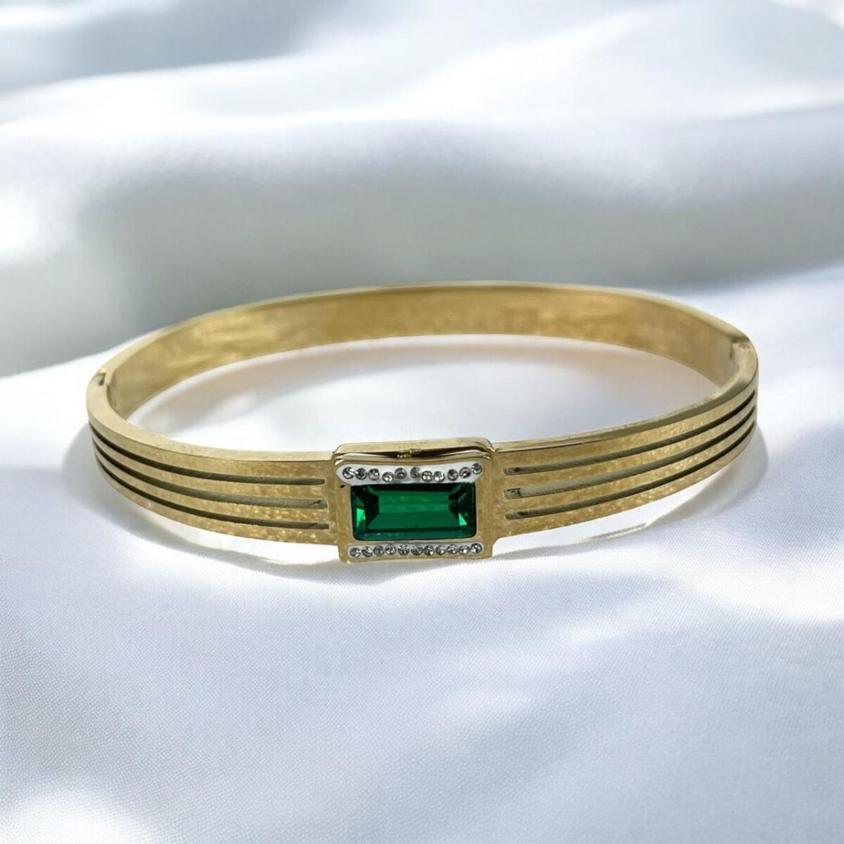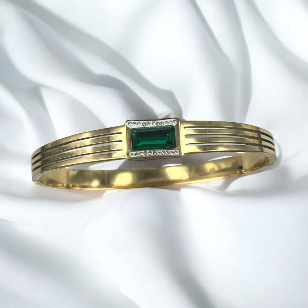 Brazalete dorado en acero inoxidable, presenta un diseño fino y texturizado con tres líneas paralelas a cada lado, brindándole un estilo moderno y simétrico. En el centro destaca una piedra rectangular verde, enmarcada por pequeñas piedras brillantes que realzan su elegancia.
